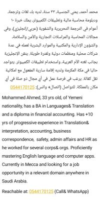 Mohammed, 33 years, of Yemeni nationality, has a BA in Languages & Translation and a diploma in financial accounting. Has + 10 years of progressive experience in Translation & interpretation, accounting, business correspondence, safety, admin affairs and HR as he worked for several corps & orgs. Proficiently mastering English language and computer apps. Currently in Mecca and looking for a job opportunity