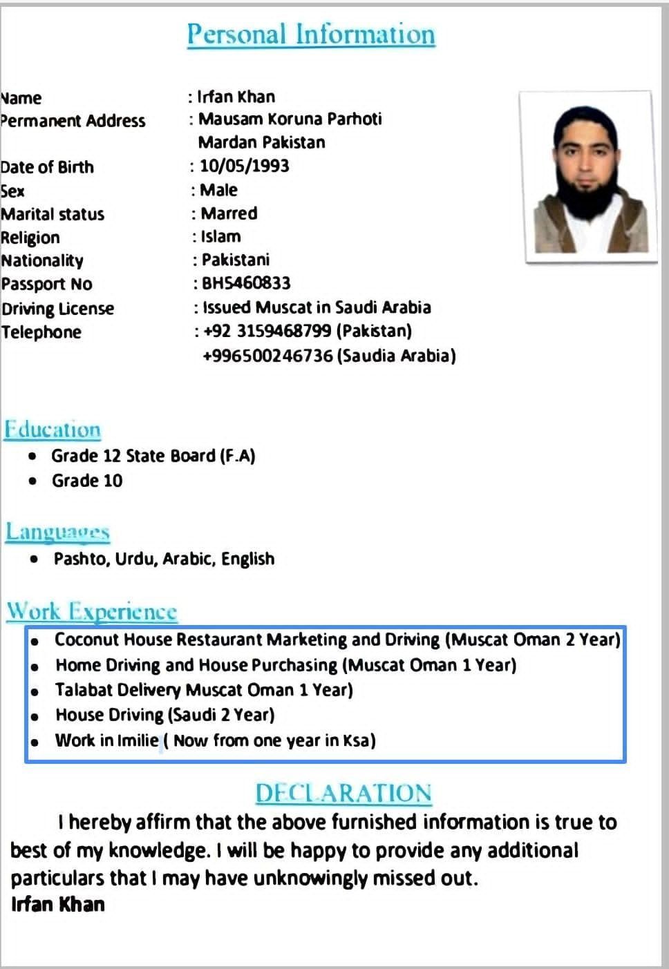 اسمي عرفان خان من باكستان، وأقيم في حائل وعمري 30، ولدي اقامة سارية ورخصة قيادة سعودية سارية، ورخصة قيادة عمانية أيضا، ولدي خبرة في عمان والمملكة العربية السعودية، والتسويق، والقيادة المنزلية، وصبي التوصيل