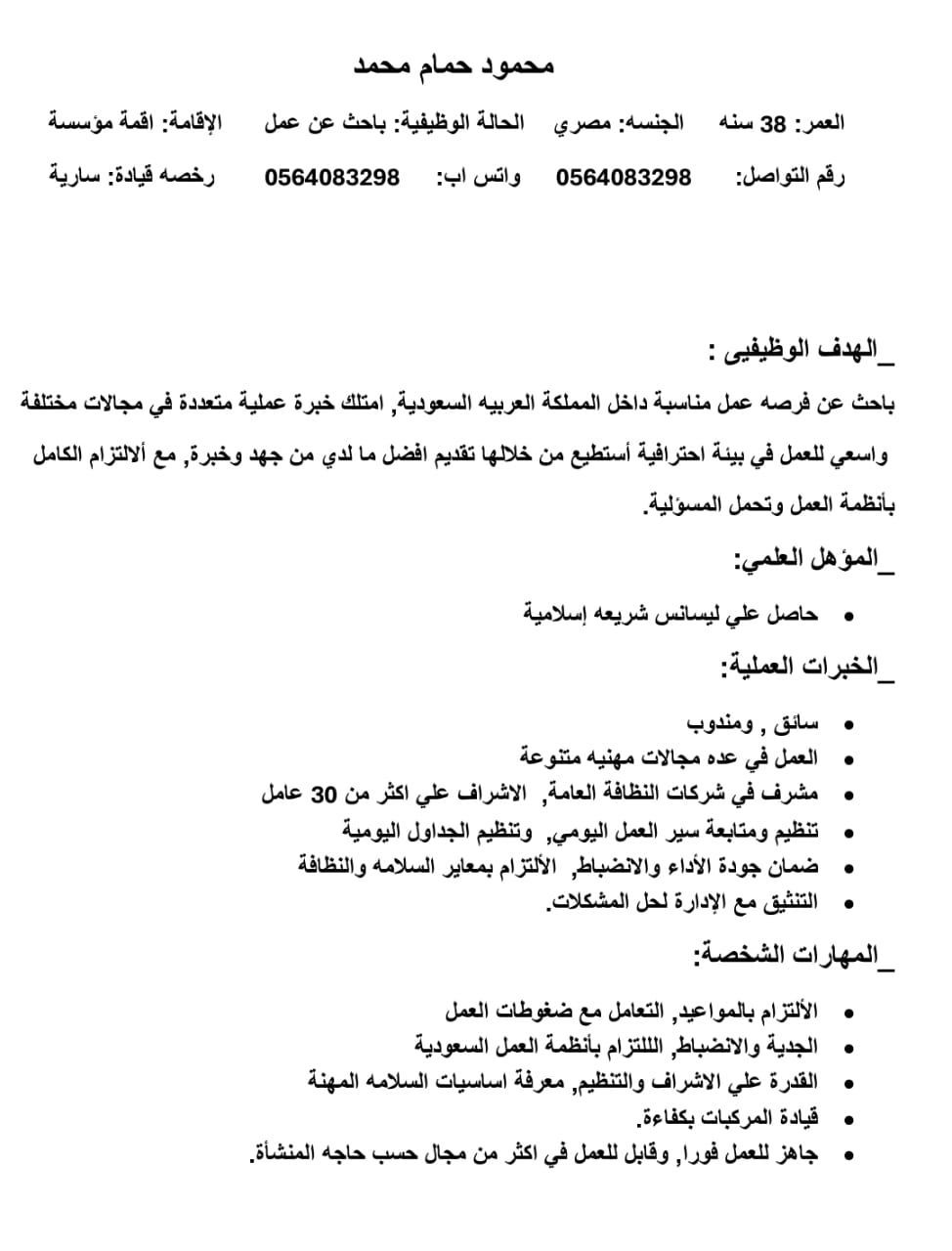شاب مصري 38 سنة، حاصل على ليسانس شريعة اسلامية، امتلك خبرة 5 سنوات في الاشراف على فرق العمل في شركات النظافة العامة، ولدي خبرة سابقة كسائق ومندوب. أتمتع بالالتزام والانضباط والعمل تحت ضغط، وأسعى للانضمام لمنشأة مستقرة داخل المملكة العربية السعودية يوجد رخصة قيادة للتواصل