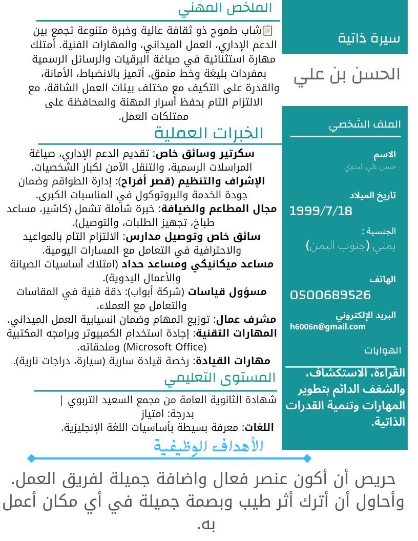 مقيم نشيط مجتهد ولكل مهمة مستعد اعمل بدون كلل أو ملل ومبتعد عن الخطأ والزلل أجيد قيادة السيارة ولي في الطبخ مهارة عندي رخصة قيادة سارية وخبرة في الأعمال الادارية اقود السيارة واحرس العمارة وأسقي أشجارة واحفظ أثاره وأتقن العمل بجدارة ملتزم بالصدق والأمانة والاخلاص في العمل بما يرضي الله أولا وبما يرضي ضم يري ثانيا المهنة سائق خاص لم أنقل من قبل يسعدني تواصلكم