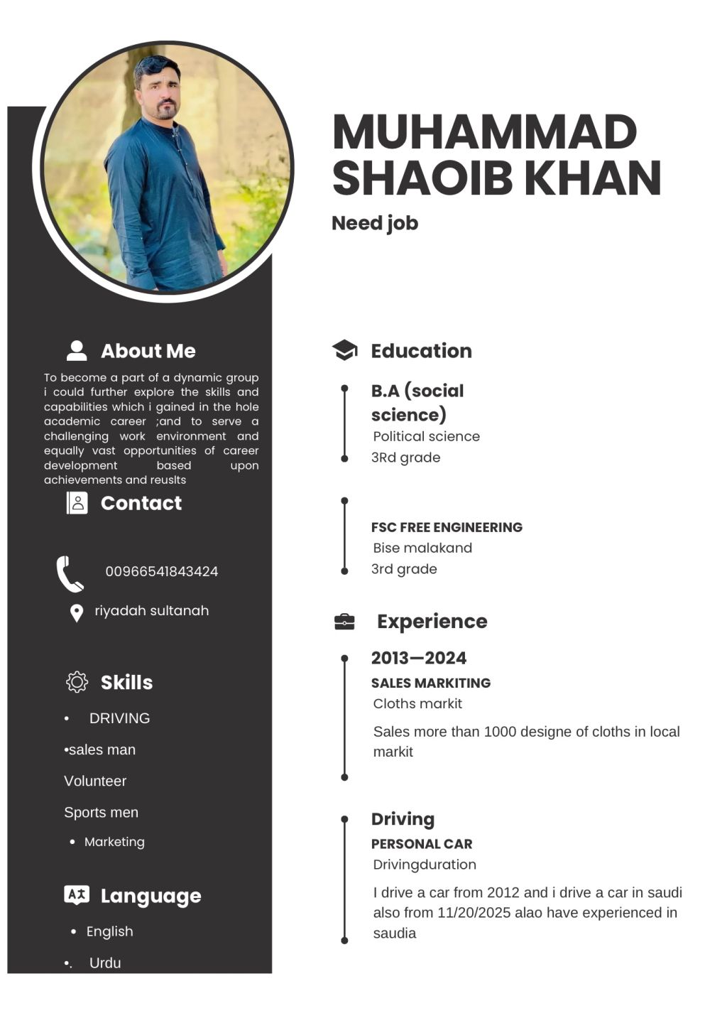 I am a driver need a job and I have valid Iqama and license house driver or company how need a driver please contact me on WhatsApp I will speek English Urdu and Poshto and little Arabic