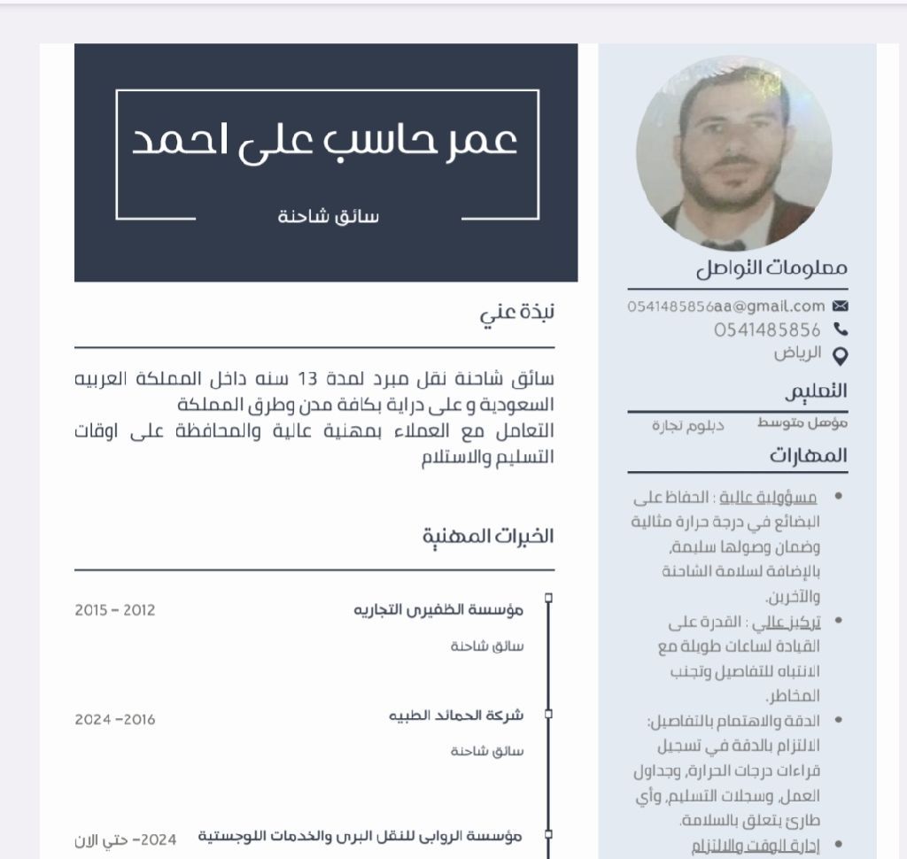 الاسم عمر حاسب / مصري الجنسية ابحث عن عمل سائق خبرة 13 سنة داخل المملكة العربية السعودية خبرة بجميع مدن المملكة العربية السعودية أقامه سارية المفعول وقابلة لنقل رخصة قيادة سارية المفعول مقيم في الرياض تواصل واتساب أو اتصل
