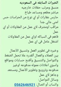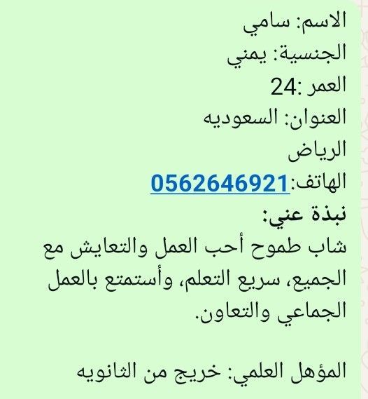 Am a young Yemeni man, currently unemployed, seeking work. I am ready and willing to do any job. I am currently located in Riyadh and have extensive experience working in various fields, including restaurants (serving as a cook's assistant) property security (villas or residential complexes) and any other security - related work