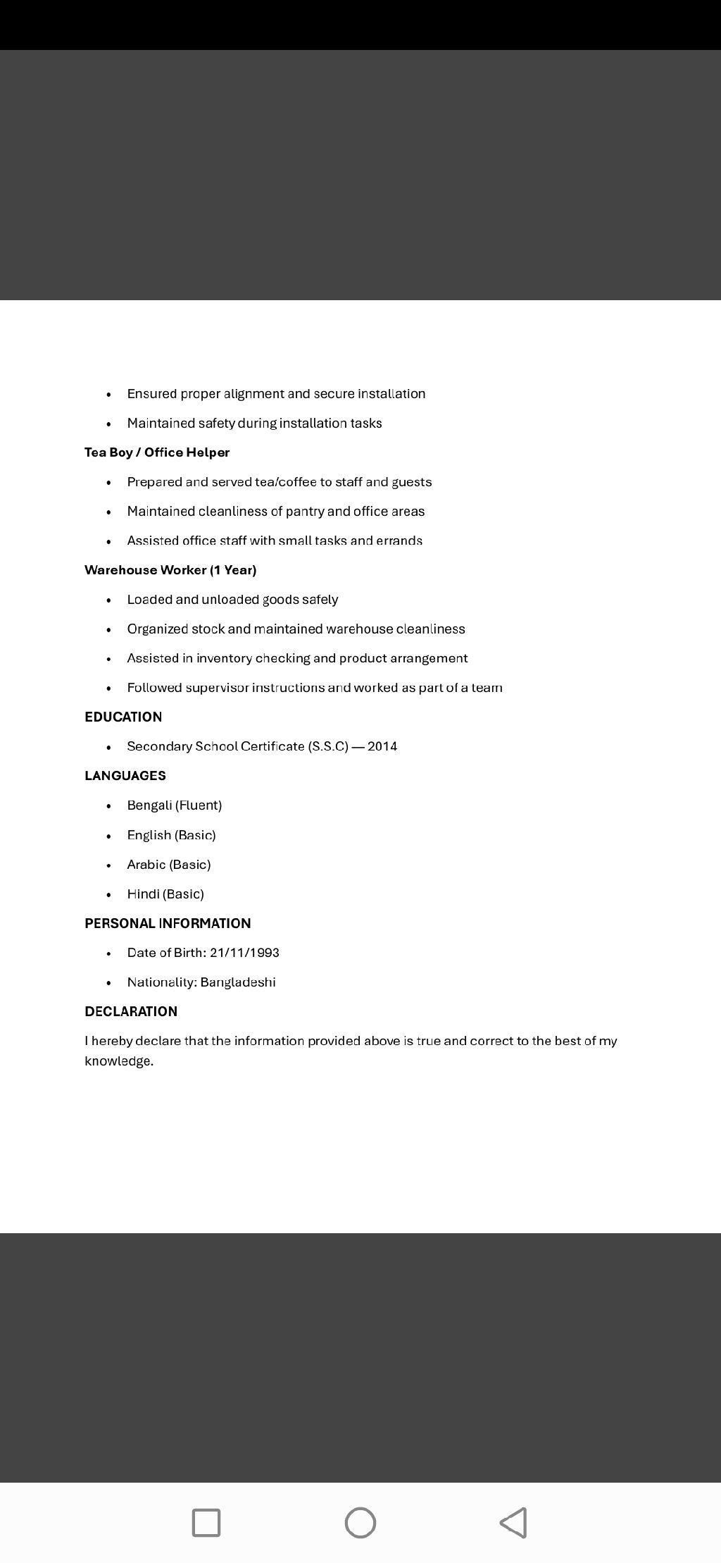 Bangladeshi driver, 28 years old, Currently in Al Khobar City with 9 years of experience in Saudi Arabia working for a trading company in the chandeliers field. Holds a valid, transferable Iqama and is seeking a suitable job opportunity