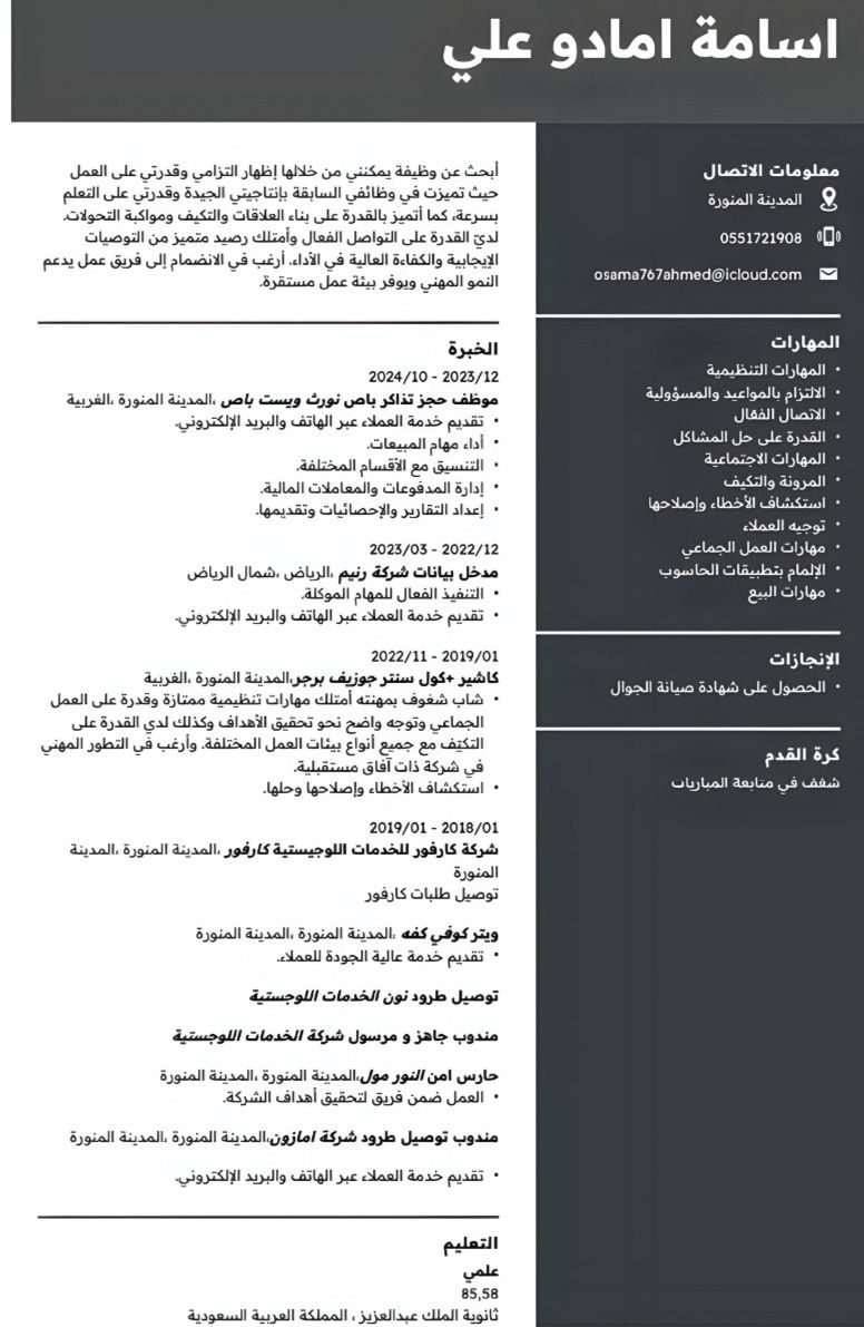أتقدم اليكم بطلب وظيفة حيث امتلك خبرة عملية في خدمة العملاء والعمليات اللوجستية. مرفق لكم سيرتي الذاتية للاطلاع عليها، وكلي أمل في الحصول على فرصة للمقابلة الشخصية. شاكر لكم وقتكم