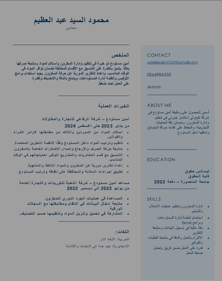 محمود السيد عبد العظيم محمود مصري الجنسية مقيم في جدة العمر 25 سنة خريج كلية حقوق بتقدير عام جيد لدي خبرة في القانون بجميع فروعه واختصاصاته / لدي خبرة في وظيفة المندوب مبيعات ومشتريات وعملت أيضا في مكتب خدمات عامة ولدي خبرة كافية