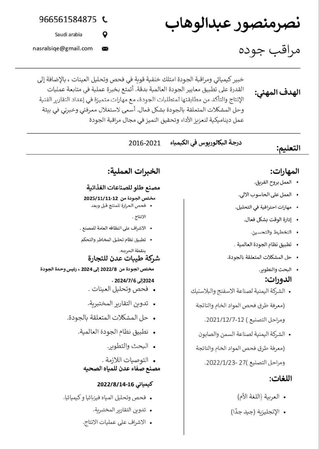 ابحث عن عمل. مراقب جودة خبرة سنتين في الجودة، فحص وتحليل العينات، وتدوين التقارير اليوميه، حل المشكلات المتعلقه بالجودة، الاشراف على عمليات التخرين، البحث والتطوير