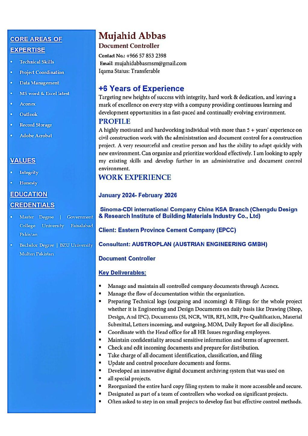 مسؤول أول عن إدارة الوثائق، ومسؤول اداري للمشاريع، ومساعد مدير مشروع، بخبرة ست سنوات في مناصب مختلفة ضمن مشاريع البناء والهندسة. حاصل على درجة الماجستير في الرياضيات ودبلوم في علوم الحاسوب