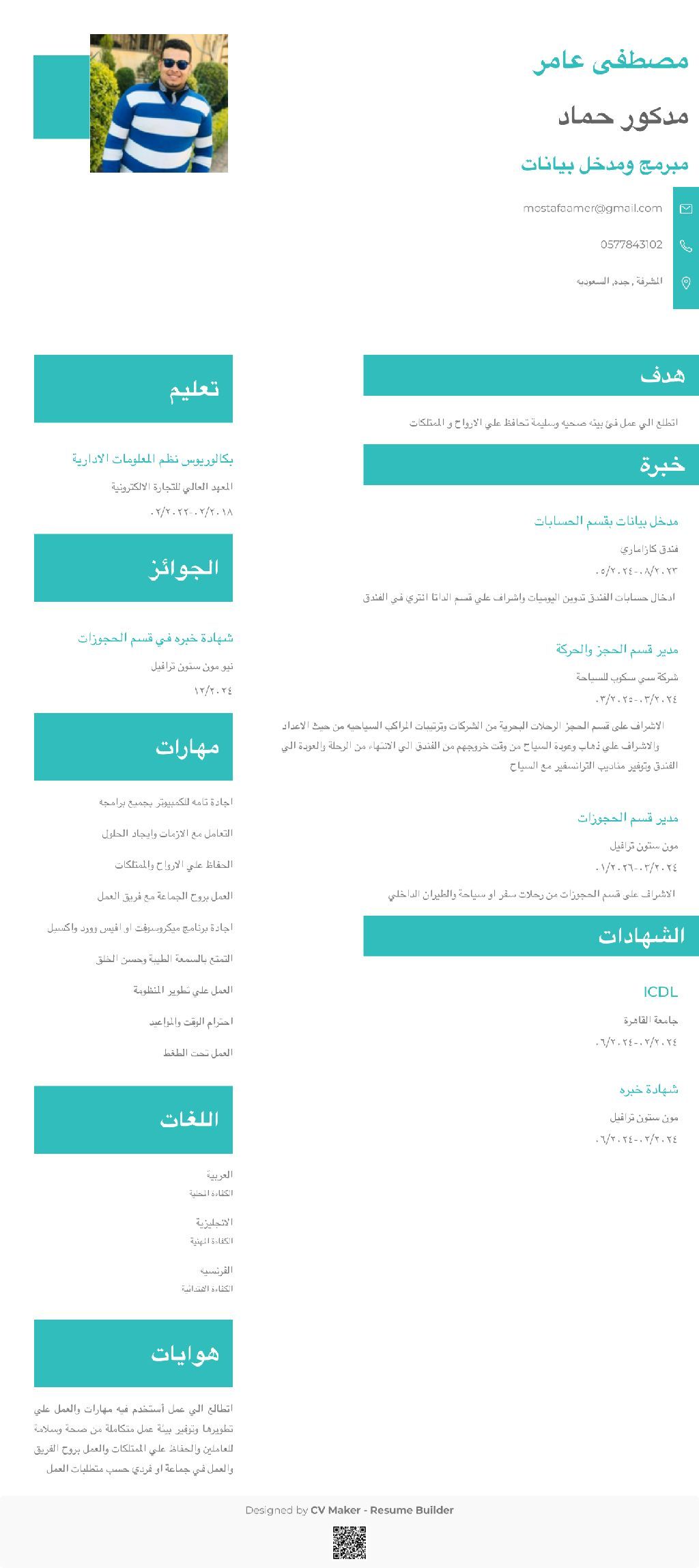 ابحث عن عمل مدخل بيانات لدي خبرة سابقه في الأعمال الاداريه وإدارة المستودعات خبرة في مجال السياحة والسفر أجيد التعامل على الكمبيوتر بجميع برامجه اجادة تامة لبرنامج الأفيس وورد أكسيل حاصل علي بكالوريوس حسابات ومعلومات سبق لي العامل مدير قسم الحجوزات بشركة سي سكوب للسياحة ومدخل بيانات في قسم الحسابات بفندق كازاماري
