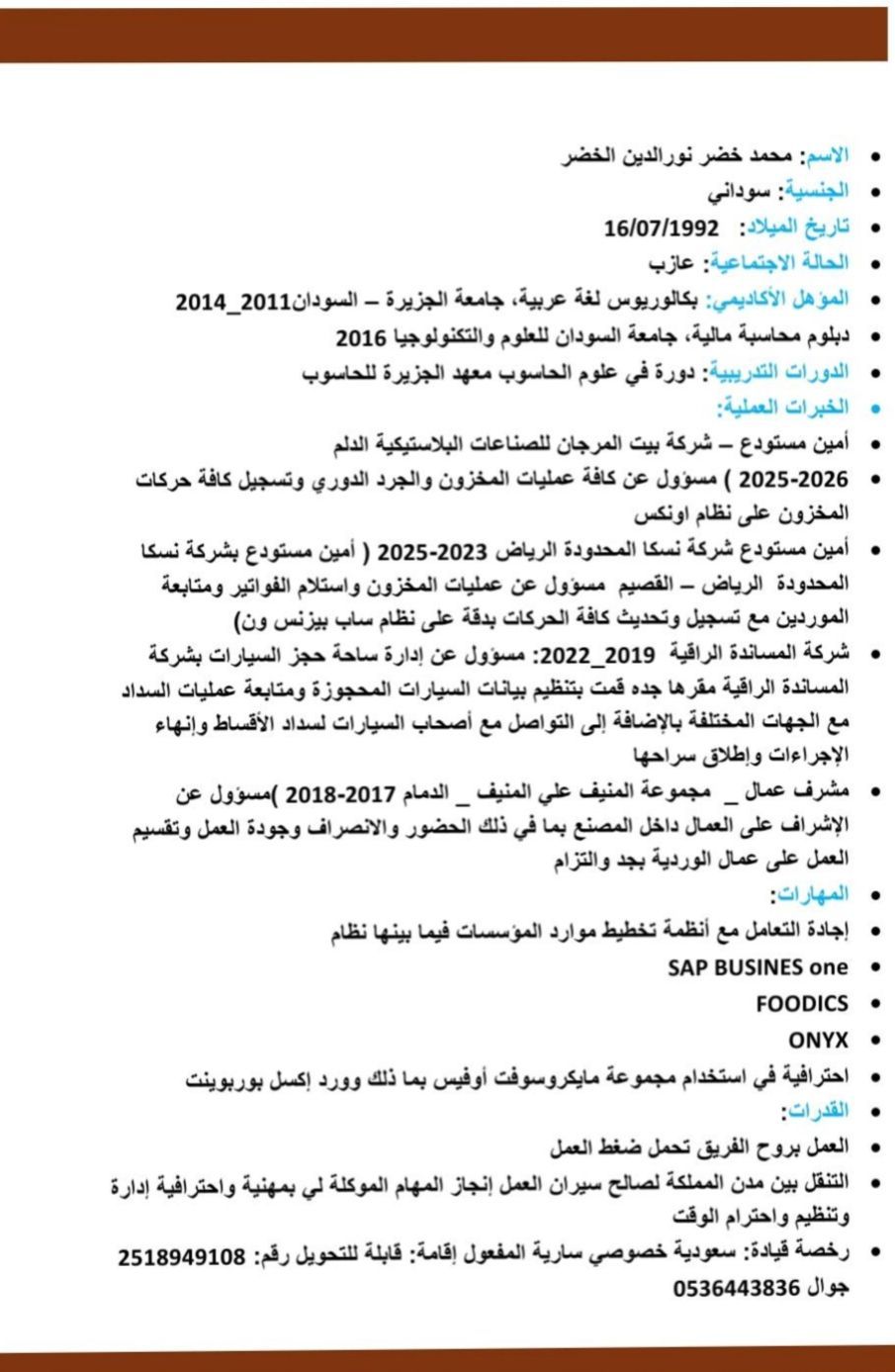 أمين مستودع محمد الخضر سوداني خبرة في المستودعات 5 سنين خبرة في أنظمة تخطيط موارد المؤسسات ERP