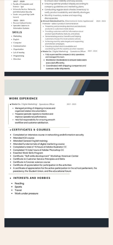 لدي خبرة اكتسبتها لمدة سنتين في العمل كاشير وكذلك ادخال بيانات والتعامل مع العملاء امتلك عدة دورات منها الاكسل وكذلك الورد والتخطيط الاستراتيجي وفن الخطابه مستعد للعمل وحريص على عملي وشغوف