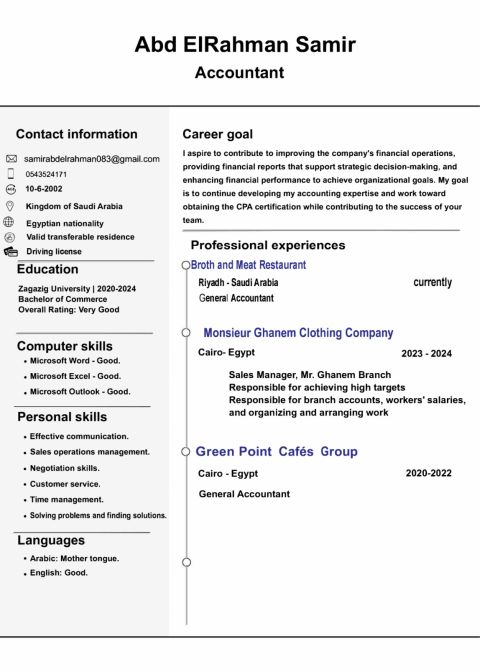 أنا محاسب مصري مقيم في الرياض ابحث عن فرصة عمل مناسبة لدي خبرة أيضا في المبيعات والإدارة ولدي رخصة قيادة وإقامة سارية