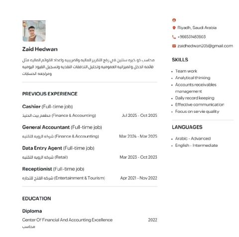 محاسب مصري مقيم في جدة وجاهز للعمل لدي خبرة في المحاسبة وبرامج ERP المحاسبية كما لدي خبرة في الموارد البشرية من صياغة العقود والخطابات الرسمية وامور التوظيف بشكل عام وجميع المنصات الحكومية من مقيم وتأمينا تي وقوي ووزارة التجارة والمركز السعودي للأعمال وغيرهم كما لدي الخبرة في الخدمات اللوجستية ومتطلبات الشركات وآلية العمل معهم وكيفية التعاقد مع جميع الشركات اللوجستية كما لدي داتا مناديب
