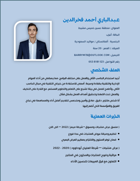 ابحث عن فرصة عمل في أي مجال ذي صلة بالحاسب الآلي أو المبيعات، سواء في محل أو متجر أو مول تجاري أو معرض. أجيد استخدام الحاسب الآلي وبرامجه المختلفة ولدي مهارة في التعامل مع العملاء وتنظيم العمل. أتميز بالصدق والأمانة والاخلاص في أداء المهام، وأسعى دائما لتطوير نفسي والمساهمة في نجاح فريق العمل وتحقيق أهداف المنشأة. موقع العمل منطقة عسير مدينة خميس مشيط أو أبها