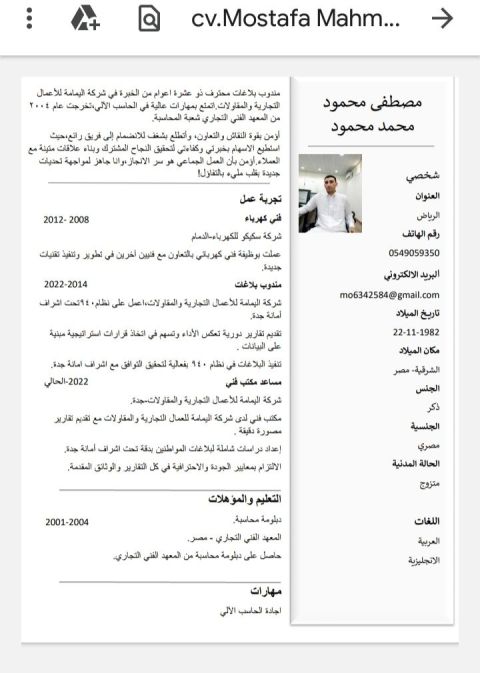 الهدف من الاعلان ايجاد فرصة عمل تم العمل في مشروع الرفع الجغرافي شركة سكيكوا للكهرباء فني والعمل في شركة اليمامة مندوب بلاغات أمانة جدة ومساعد مكتب فني حاصل على دبلومة المحاسبة معهد فني تجاري اجادة الحاسب الآلي أرجو التواصل والاهتمام