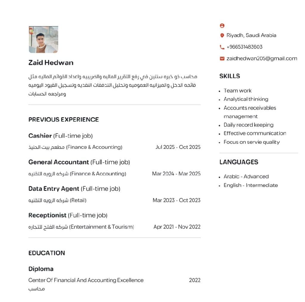 عملت من قبل فاهم للحسابات وعندي شهادات محاسبه اشتغالات في مطاعم أتكلم مع الزبون بالباقة
