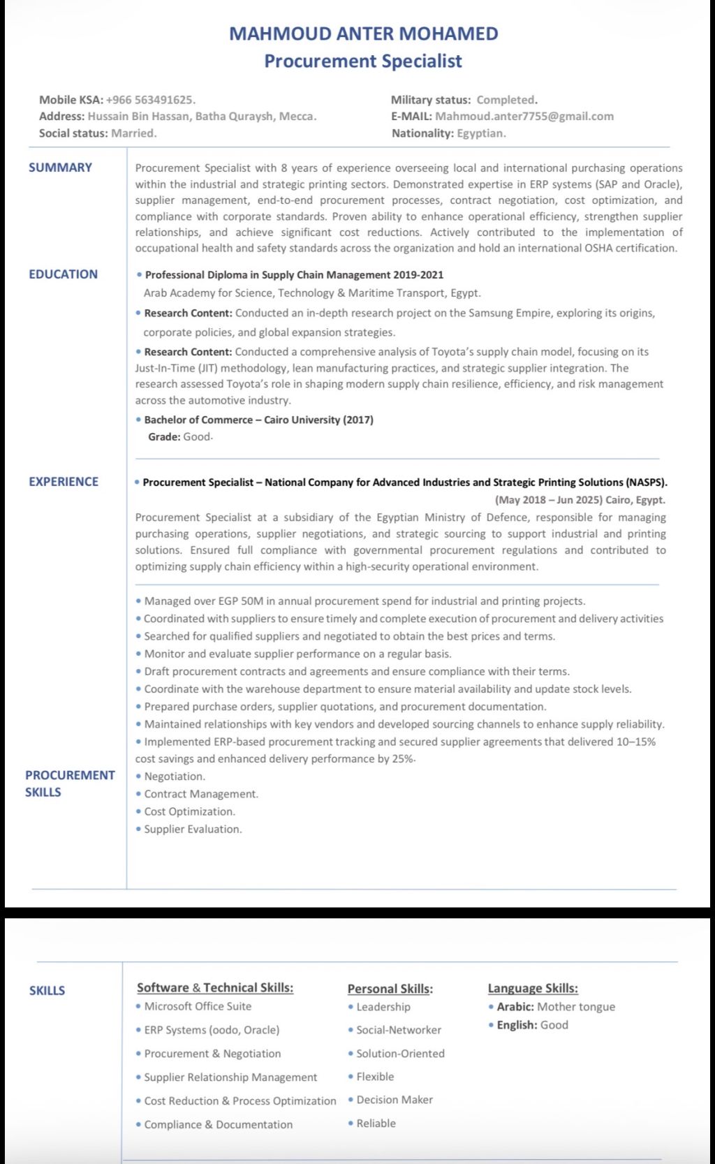 Procurement Specialist with 8 years of experience in local and international purchasing within Industrial and printing sectors. Skilled in ERP systems (SAP, Oracle) supplier management, negotiation, and cost control. Proven record in boosting efficiency, ensuring compliance, and applying safety standards. OSHA certified professional