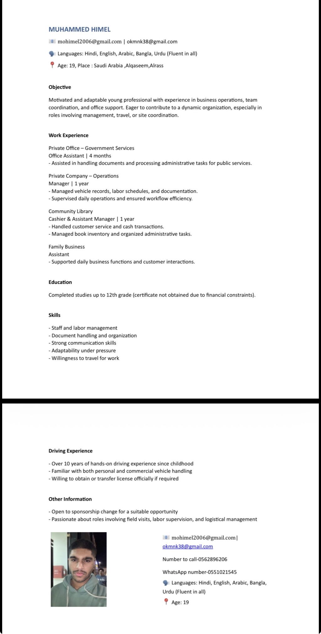 Title Multilingual Operations & Admin Supervisor Summary 16 months experience in labor & fleet management + gov admin (Iqama/ Licenses) Languages Arabic, English, Hindi, Bangla. Skills field supervision, logistics, and office admin. Status Ready to join immediately