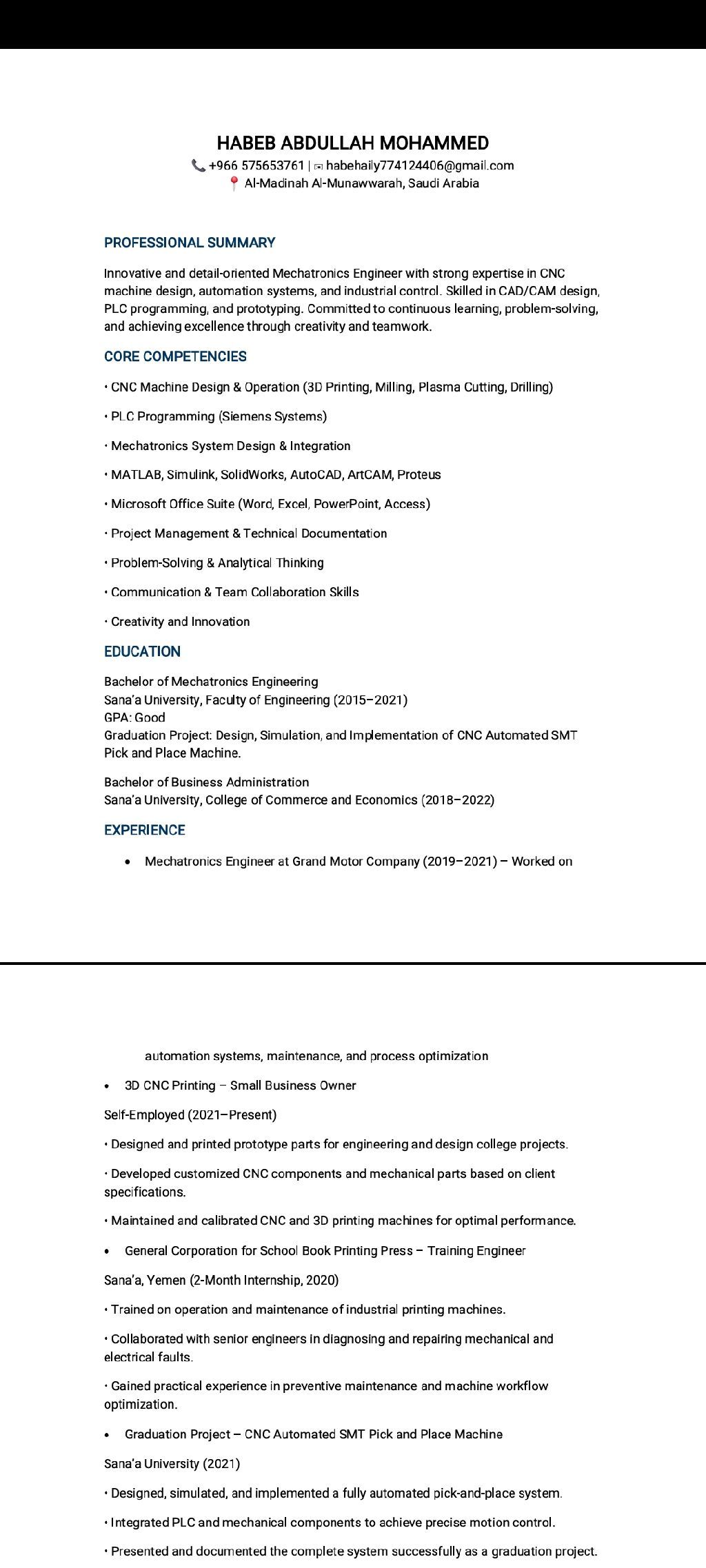 مهندس الكتروميكانيك بخبرة سنوات في مجال المقاولات وتنفيذ الأنظمة الميكانيكية والكهربائية. خبرة في تشغيل وصيانة اجهزة CNC. وتنفيذ أعمال الكهرباء والميكانيكا، وحساب الأحمال، ومراجعة المخططات. متقن لحصر الكميات وطلب المواد، والاشراف على الأعمال بالموقع، واستلام وتسليم أعمال حسب المواصفات والكود. قادر على حل المشكلات الفنية وتقديم حلول مناسبة لطبيعة المشروع للتواصل