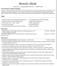 مصطفى البيك، 28 سنة، بكالوريوس علوم حاسب ونظم المعلومات، خبرة 4 سنوات في مجال المشتريات، خبرة 1 سنة في الاستيراد (داخل المملكة) خبرة 1 سنة في مجال الشبكات الالكترونية والبرمجة، قوي في استخدام الكمبيوتر، متحدث جيد جدا الانجليزية، أملك رخصة قيادة، مقيم حاليا في جدة