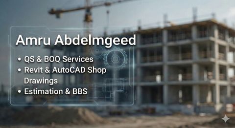مهندس مدني متخصص في حصر الكميات واعداد مخططات الاوتوكاد والريفيت حاصل علي درجه البكالوريوس. خبير في اعداد جداول الكميات (BOQ) وأعمال الحصر بالاضافة الى اعداد مخططات الورشة (Shop Drawings) وتفاصيل حديد التسليح (BBS) أجيد العمل باحترافية علي البرامج الهندسيه AutoCAD Revit & Excel أتميز بالدقة العالية والالتزام بالمواعيد، معه اجادة ممتازة للغة الانجليزية
