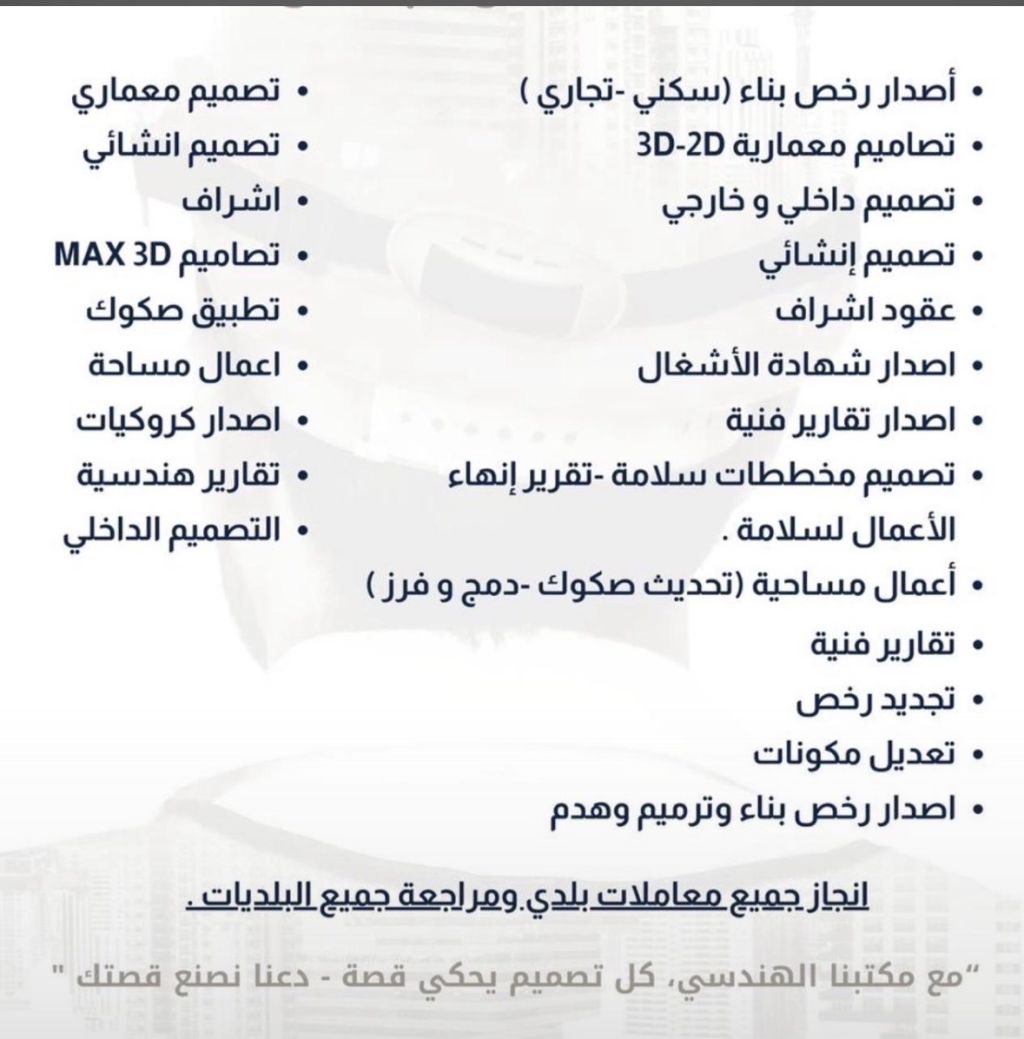 استخراج تراخيص منشاءات سكنية وتجارية - عمل مخططات معمارية والكتروميكانيك - اسخراج تراخيص ترميم - صكوك الكترونية - رخص تشغيل - رخص ومخططات دفاع مدني - معاملات تعديل واضافة - رفع مساحي وكروكي تنظيمي - مخططات معمارية تنفيذية - مخططات انشائية تنفيذية وشوب درونج