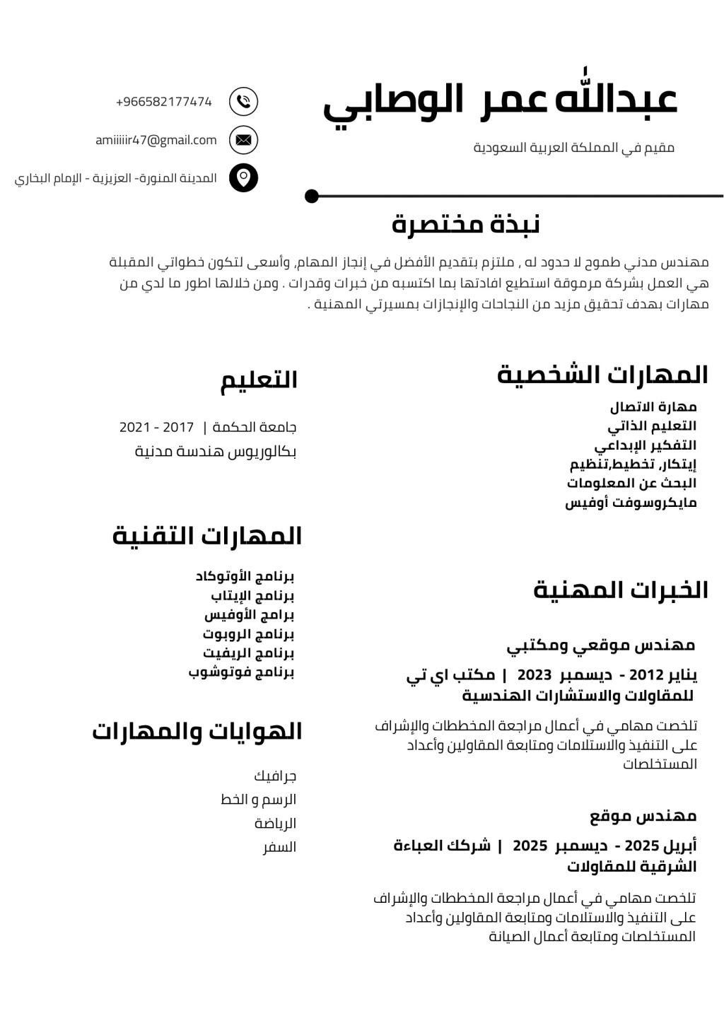 مهندس مدني حاصل على بكالوريوس هندسة مدنية، ابحث عن فرصة عمل مناسبة في مجال الهندسة. أو مجال آخر مبيعات كاشير محاسب. عملت في مجال الهندسة لمدة 7 أشهر في المدينة المنورة