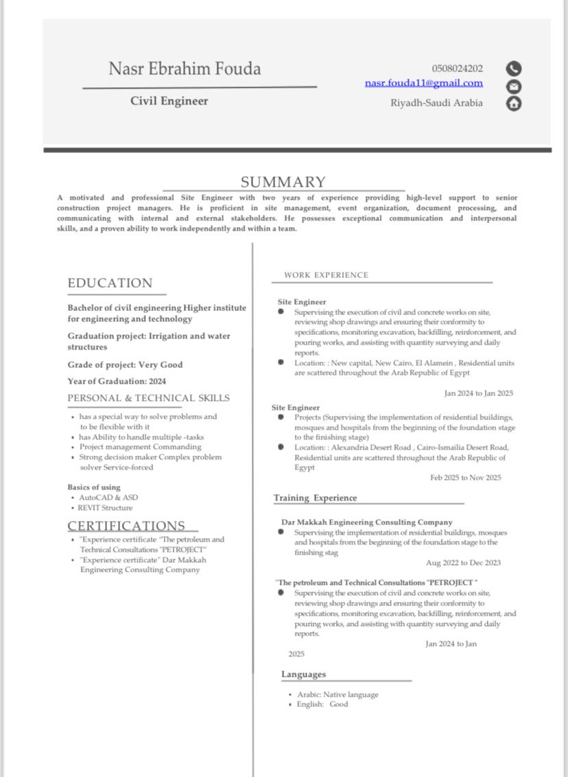 مهندس مدني تنفيذ مواقع - متابعة مشاريع إنشاءات. الوصف تقديم خدمات متابعة وتنفيذ مشاريع إنشاءات سكنية وتجارية وصناعية - أعمال اشراف على التنفيذ اليومي للموقع - متابعة العمال والمعدات - تنفيذ الخرسانة، التسليح، الأعمال المعمارية والانشائية - حصر كميات وتقارير أسبوعية - الموقع الرياض والمناطق المجاورة