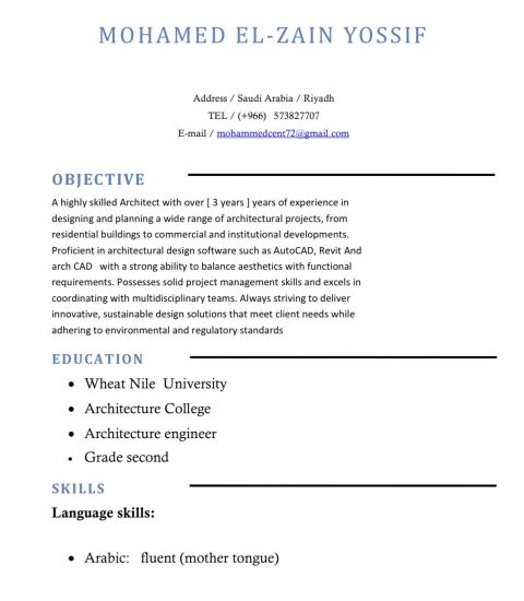 مهندس معماري، اشراف موقع وتصميم عملت في العديد من المواقع في الرياض تصميما واشرافا وشار فت على انهاءها حاليا، معتمد في هيئة المهندسين لدي اقامة سارية، خبرة تزيد عن 8 سنوات ولدي خبرة في البرامج الهندسية حيث قمت بتدريسها سابقا لمهندسين حديثي التخرج وقد سبق لي القيام بالعديد من الأعمال تصميما واشرافا مع مؤسسات ومكاتب خاصة بالهندسة ولدي معرفة بالكود السعودي والاشتراطات