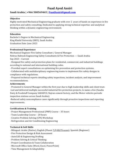 مهندس ميكانيكا (سعودي) خبرة سنتين في الاستشارات الهندسية في مجال الاطفاء والانذار والسلامة تصميم واستلام واشراف عندي الدورات الموضحة في السيرة الذاتية المرفقة في الصور واعتماد في هيئة المهندسين