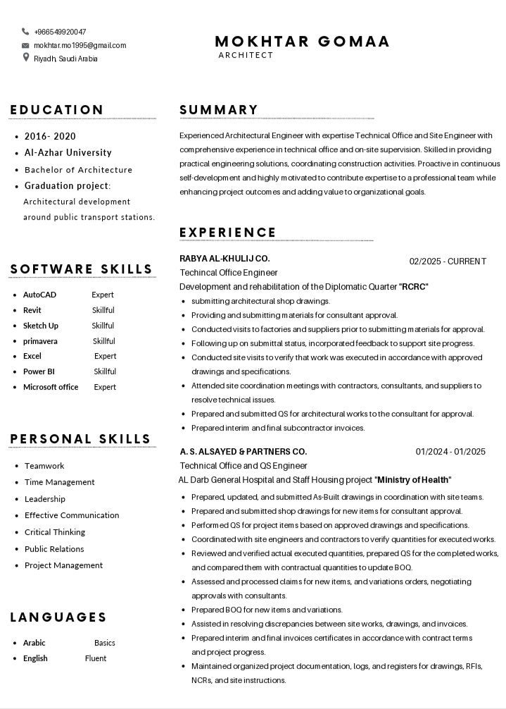 مهندس معماري خبرة بأعمال المكتب الفني والاشراف على التنفيذ - Shop Drowing الحصر وحساب الكميات QS - المستخلصات - as built الاشراف على بنود التشطيبات المعماريه التعامل مع الاستشاري وتقديم الاعتمادات المطلوبه RFI, MS, IR