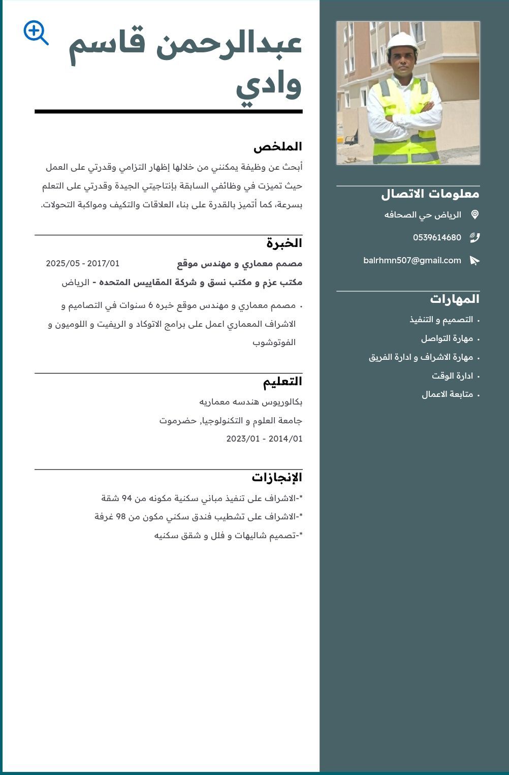 مهندس معماري خبرة 5 سنة في المكاتب الهندسيه وفي أعمال التشطيبات والاشراف على المباني اعمل على برنامج الريفيت والاوتوكاد واللوميون والفوتوشوب