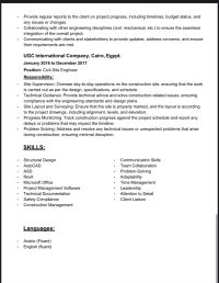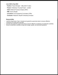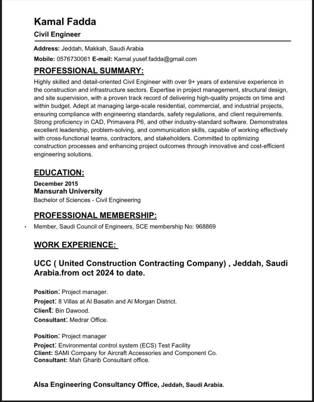 مهندس مدني مصري الجنسية متواجد داخل المملكة، خريج جامعة المنصورة وحاصل على عضوية الهيئة السعودية للمهندسين، لدي خبرة في تنفيذ المشاريع لمدة 10 سنوات منها 3 سنوات داخل المملكة ولدي خبرة في مشاريع الاسكان التنموي ومشاريع المطار، وملم جيدا بأعمال التنفيذ والاشراف بالمنشاءات الادارية والسكنيه وأعمال البنيه التحتية وملم جيدا بأعمال المكتب الفني (تسعير وحصر كميات وأعمال الشوب دروينج معماري وانشائ)