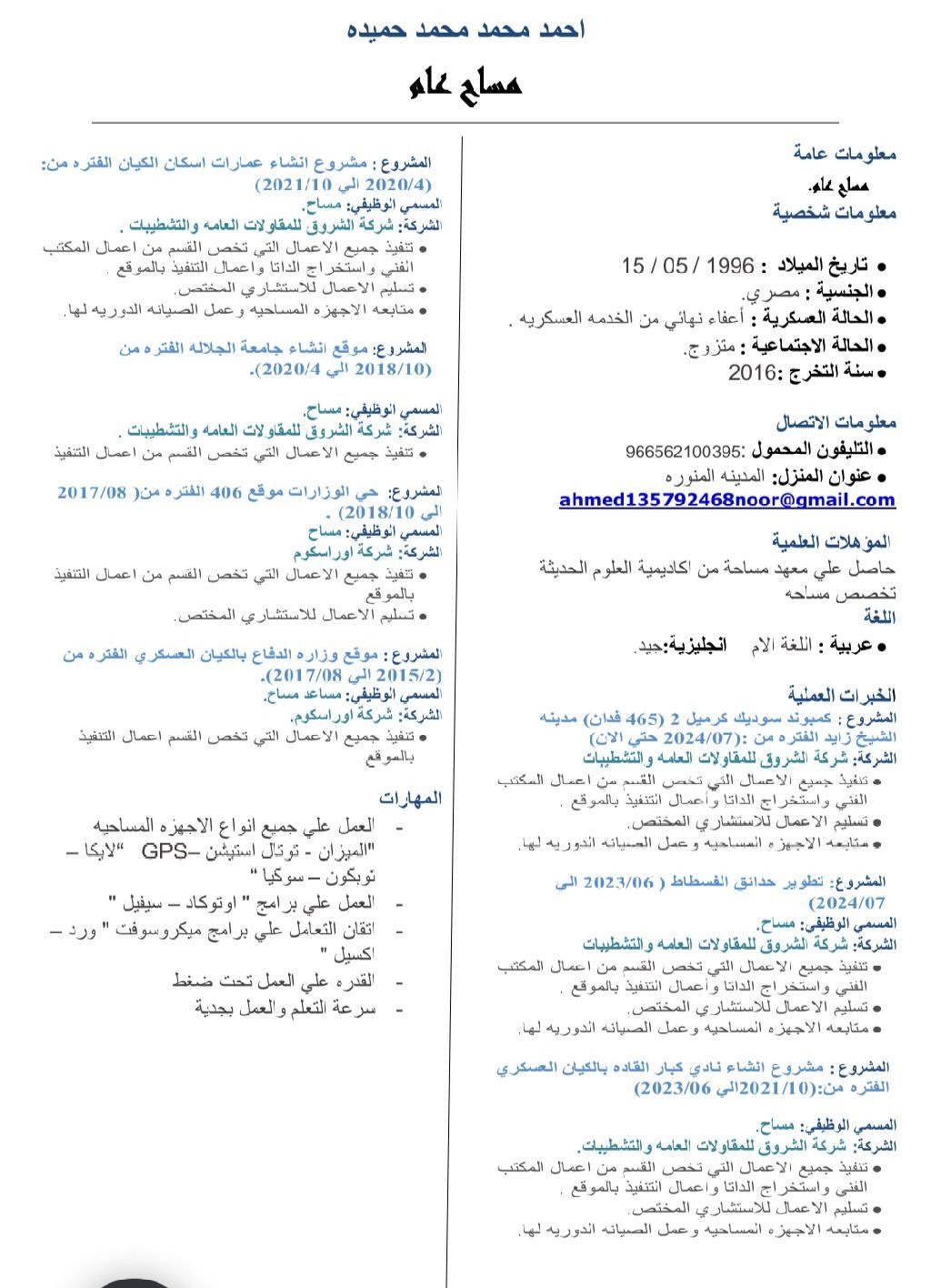 أنا مساح عام لدى خبرات كبيرة (8 سنوات خطبره) في جميع اجهزة المساحة وبعض البرامج المساحية CAD - لدي اقامة سارية وقابلة النقل. متواجد في الرياض حاليا