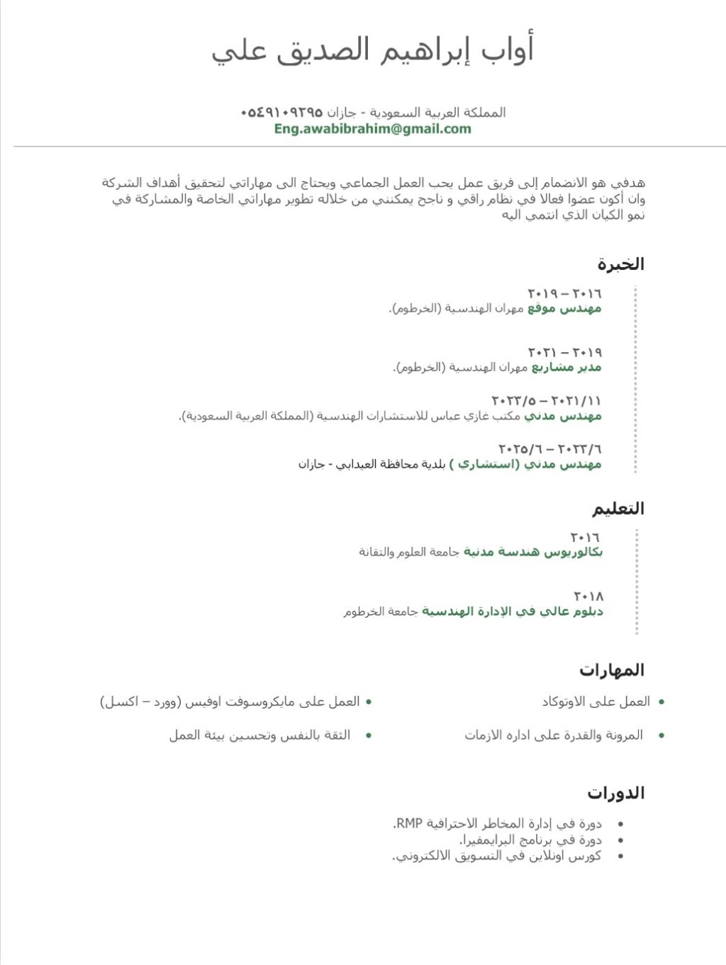 مهندس مدني مقيم خبرة أكثر من 8 سنوات منها 4 سنوات داخل المملكة ادارة مشاريع - اشراف على المشاريع السكنية والحكومية ومشاريع الطرق، حيث أني عملت كاستشاري لقيم المشاريع في جهة حكومية. عضوية لدى الهيئة السعودية للمهندسين ورخصة قيادة وإقامة قابلة للنقل