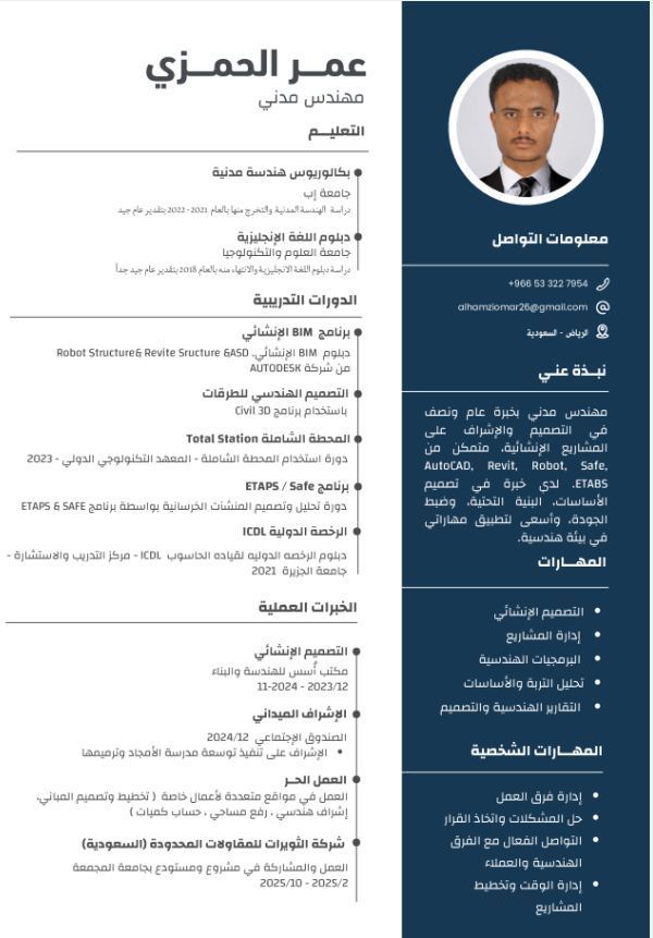 مهندس مدني خبرة ثلاث سنين منها سنة ونصف بالمملكة بمشروع حكومي في الرياض في جامعة المجمعه ابحث عن فرصة عمل مجال التصميم الانشائي والاشراف على المواقع وتنفيذ الأعمال الخرسانية وملم بقراءة المخططات الانشائية وحساب الكميات متواجد في المملكة ومتاح للعمل في أي مكان بالمملكة لدي رخصة قيادة سيارة إقامة سارية