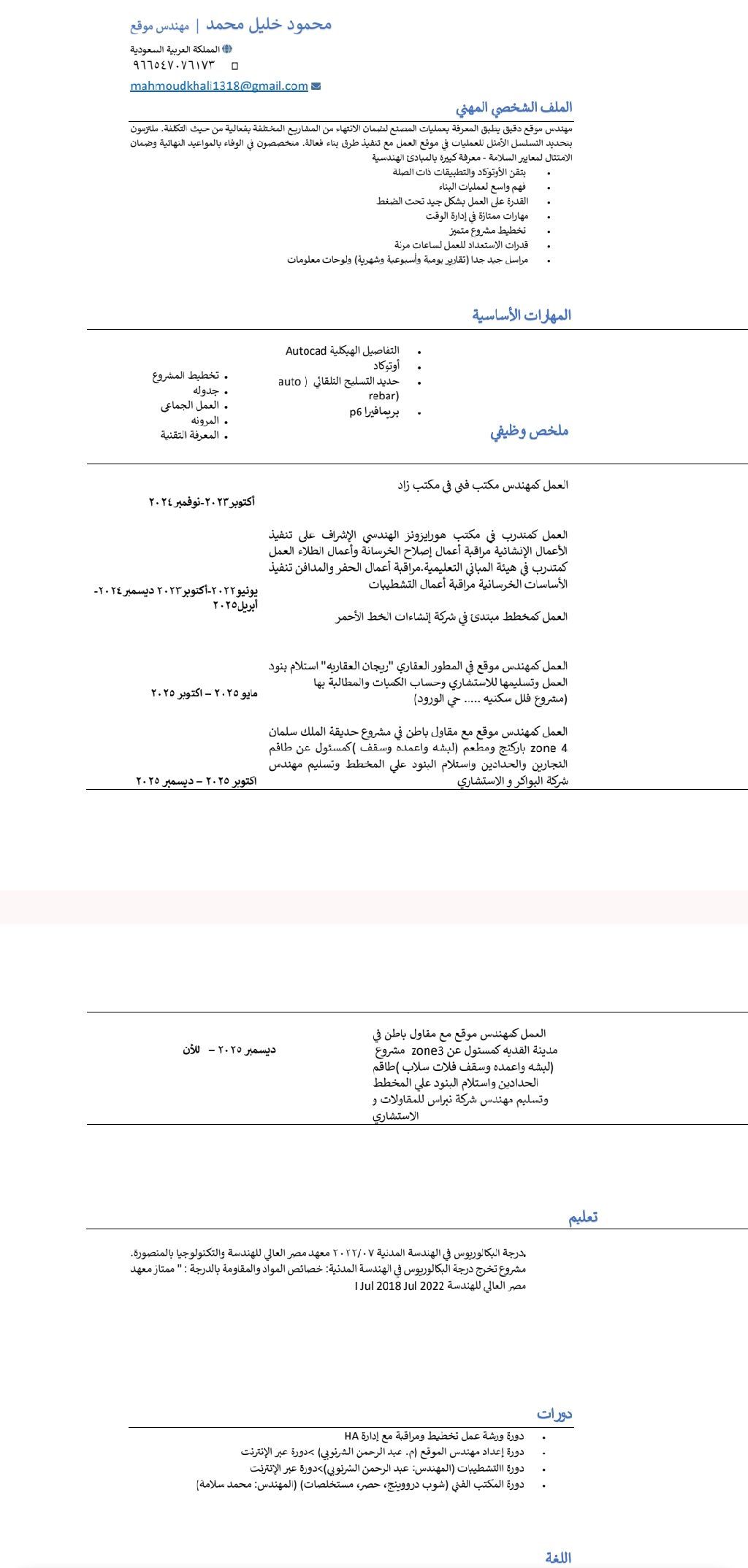 مهندس مدني خبرة ثلاث سنوات سبق لي العمل في شركات مقاولات عملت كمهندس موقع خرسانات وتشطيبات وأيضا عملت كمهندس مكتب فني (شوب دروينج - حصر - مستخلصات - عمل جداول زمنيه باستخدام بريما فيرا)