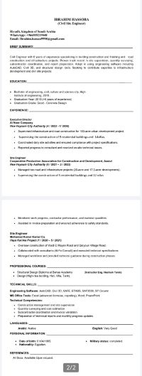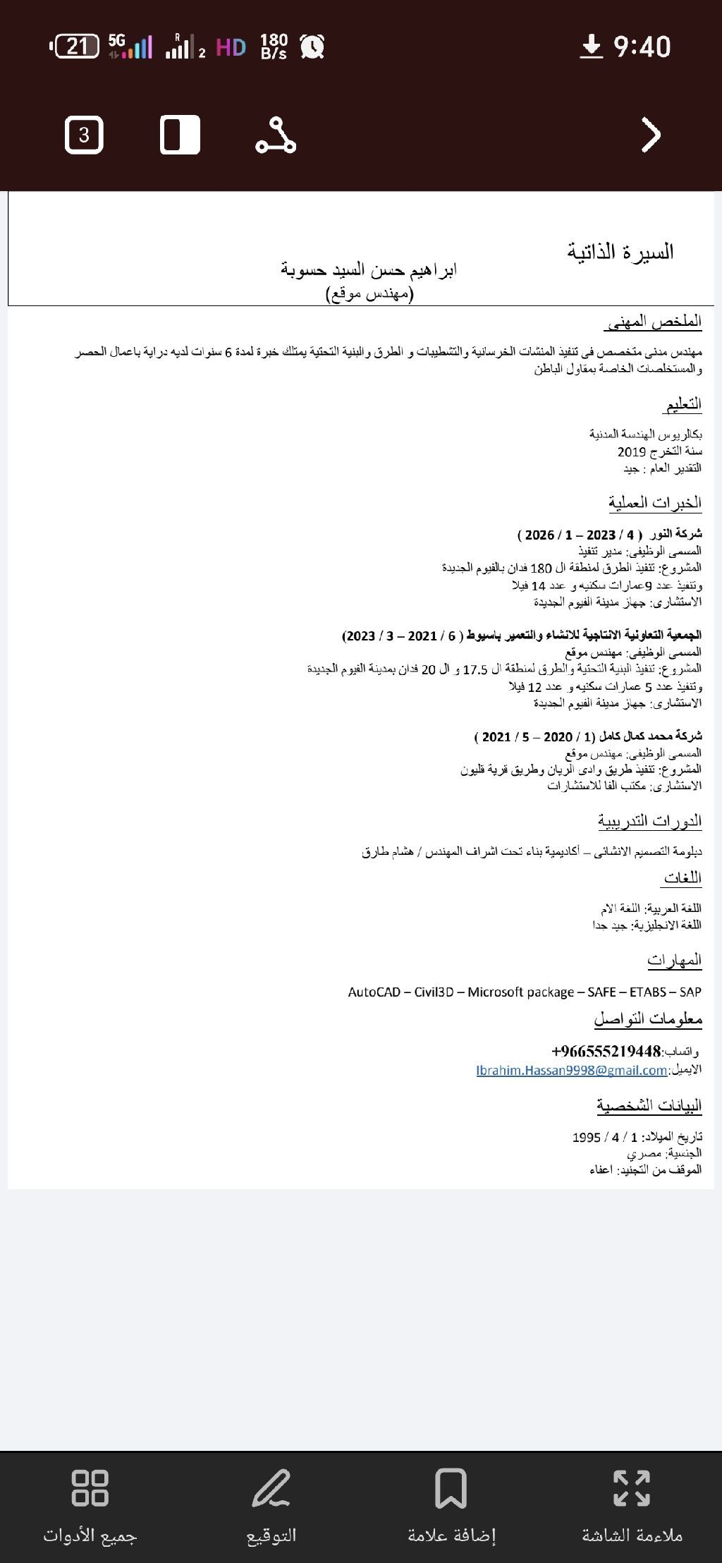 أنا إبراهيم حسن مهندس مدني متخصص في تنفيذ الطرق امتلك خبرة لمدة 6 سنوات في أعمال الطرق والبنية التحتية لدي دراية بأعمال الحصر والمستخلصات الخاصة بمقاول الباطن أجيد استخدام البرامج الهندسية مثل AutoCAD وCivil 3D وأدوات التصميم الانشائي