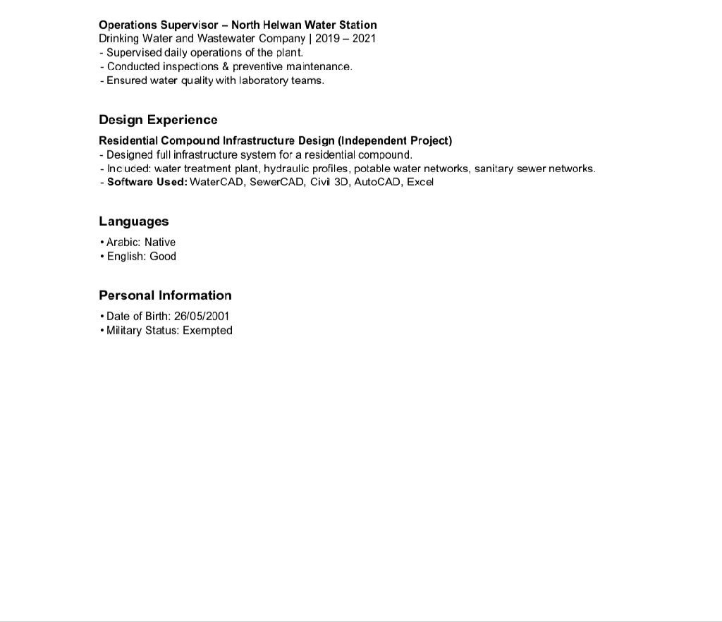 مهندس مدني بنية تحتية عملت فني تشغيل بمحطة مياه شمال حلوان سنة ونصف ثم عملت بمحطات الصرف الصحي فني تشغيل وصيانة الهندسية لمدة عام بشركة مياه القاهرة حاليا مدير التشغيل والصيانة بمحطة مياه شمال حلوان ذو كفاءة في التشغيل والصيانة لمحطات مياه الشرب والصرف الصحي أجيد تصميم الشبكات والمحطات خبرة ست سنوات بالاضافة الى مهندس تصميم بنية تحتية بمكتب مصر استشارات