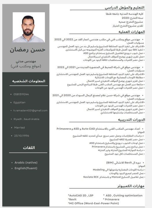 مهندس مدني خبرة أكثر من 5 سنوات في المملكة بالموقع والمكتب الفني كالحصر وعمل المستخلصات وعروض الأسعار والشوب دروينج وتنفيذ الخرسانات والتشطيبات وأعمال العزل المائي والحراري وخبرة بالبرامج الهندسة كالاوتوكاد والريفيت والأكسيل ولدي رخصة قيادة وإقامة سارية وايجاده اللغة الانجليزية