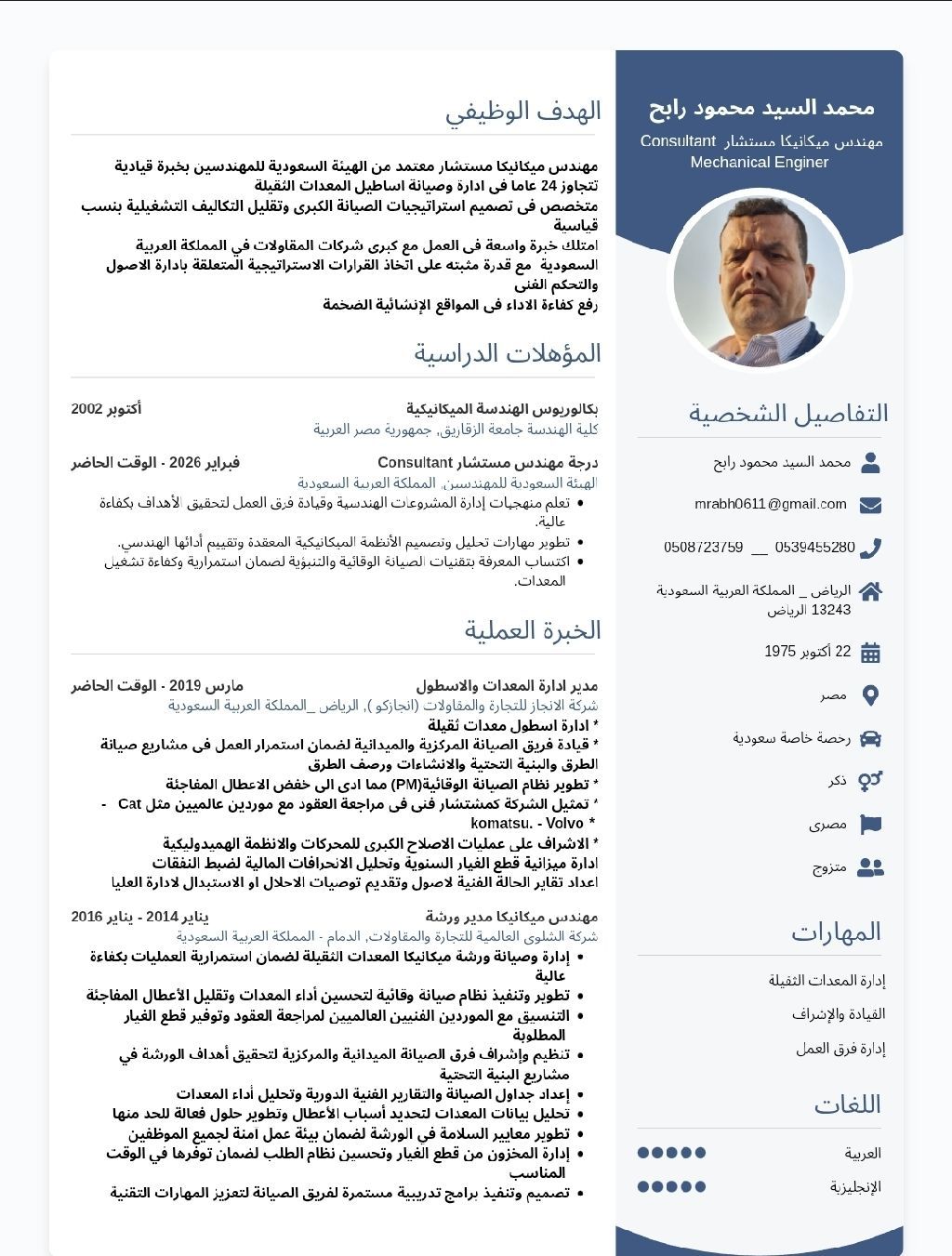 مهندس ميكانيكا خبرة في شركات المقاولات بالمملكة العربية السعودية مقيم في الرياض مصنف من الهيئة السعودية للمهندسين بدرجة مستشار حاصل على بكالوريوس هندسة تخصص ميكانيكا ولدى شهادات خبرة ودورات في Fire Fighting والأمن والسلامة والصحة المهنية