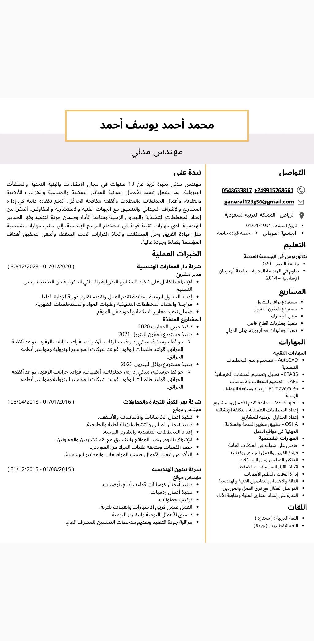 مهندس مدني سوداني الجنسية خبرة 10 سنوات في مجال الإنشاءات والبنية التحتية والمنشاءات البترولية بما يشمل الأعمال المدنية الأعمال الخرسانية، مباني، تشطيبات، جملونات، مظلات، مع اجادة البرامج الهندسي واعداد الجدوال الزمنية. إقامة سارية
