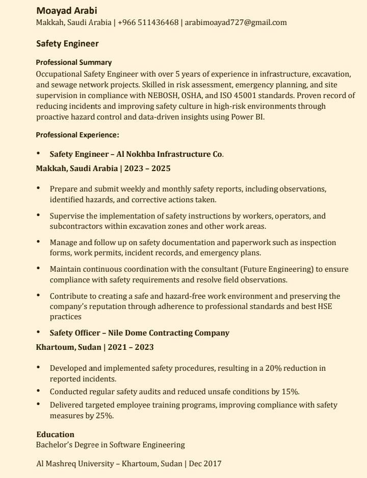 مهندس سلامة مهنية - جاهز للعمل فورا مهندس سلامة مهنية بخبرة تتجاوز 5 سنوات في مشاريع البنية التحتية وشبكات الصرف الصحي، واعمل حاليا في مشاريع روشن ضمن منظومة HSE عالية المعايير. حاصل على NEBOSH وOSHA وISO 45001 والإسعافات الأولية، ومهارات في تقييم المخاطر وTBT والتفتيش اليومي واعداد التقارير. جاهز للعمل فورا. مكة المكرمة - ولدي خبرة قوية في الاشراف الميداني والتعامل مع الحوادث