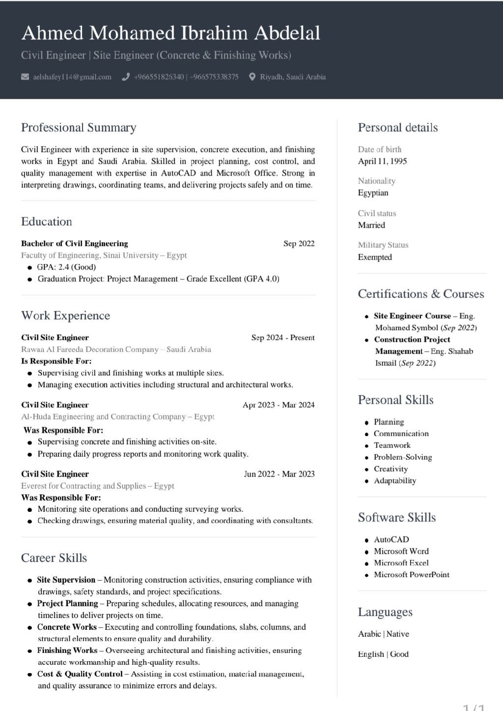 مهندس مدني مصري خبرة سنتين في مصر الانشاءات وسنة في السعودية في التشطيبات المعمارية القدرة علي الاشراف الهندسي لضمان أفضل جودة متاح للعمل في أي مكان في السعودية