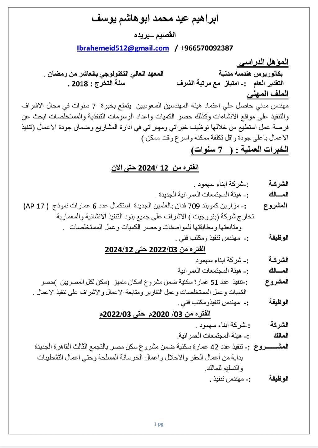 مهندس مدني باحث عن عمل خبرة 7 سنوات في أعمال التنفيذ للأعمال العظم والتشطيبات وحصر الكميات وعمل المستخلصات للمالك والمقاولين الباطن واعتماد الخامات وعمل التقارير اللازمة للمشروع متواجد في القصيم بريده معي اقامة قابلة للتحويل معتمد من هيئة المهندسين السعودين وجاهز للعمل فورا في مكان داخل المملكة