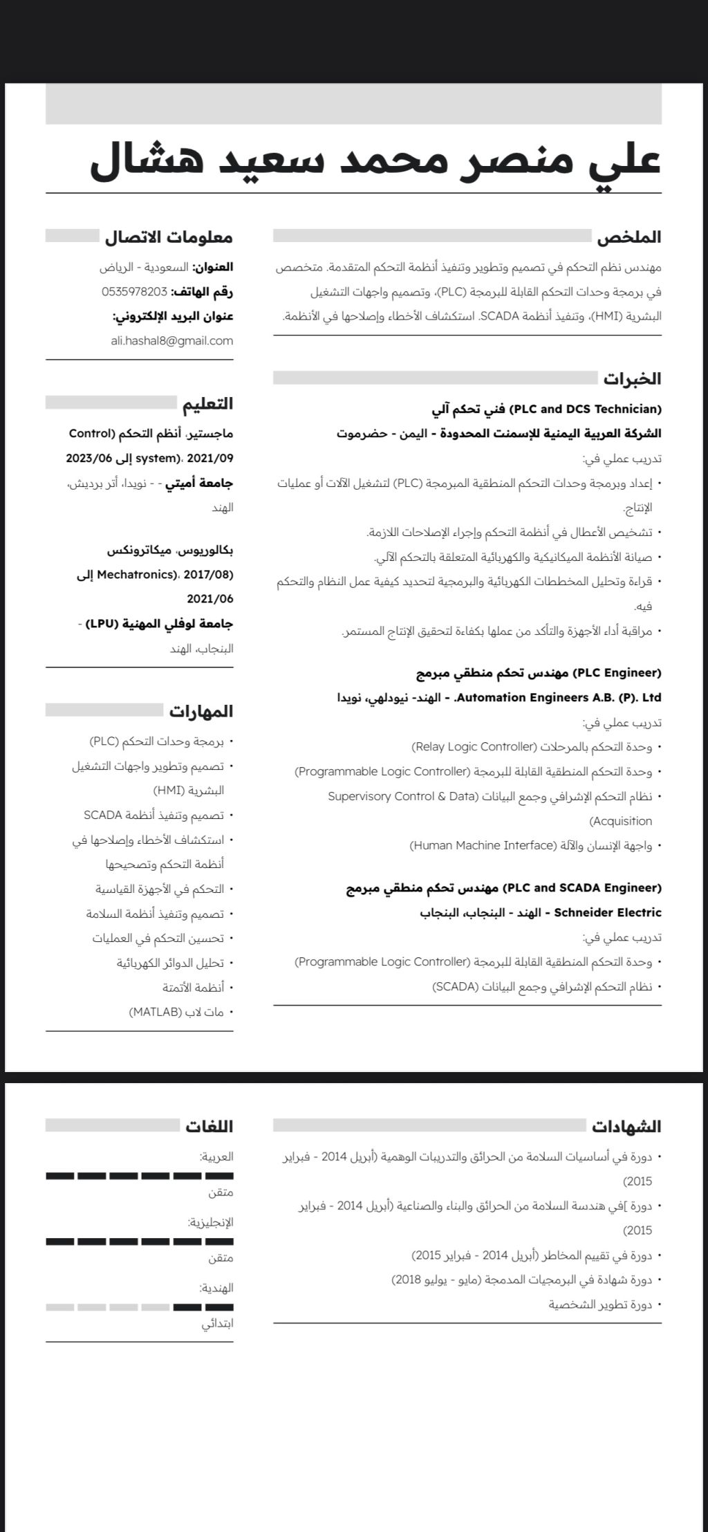 مهندس أنظمة تحكم انسترومنت كهرباء ماجستير يجيد التعامل مع PLC, SCADA and HMI