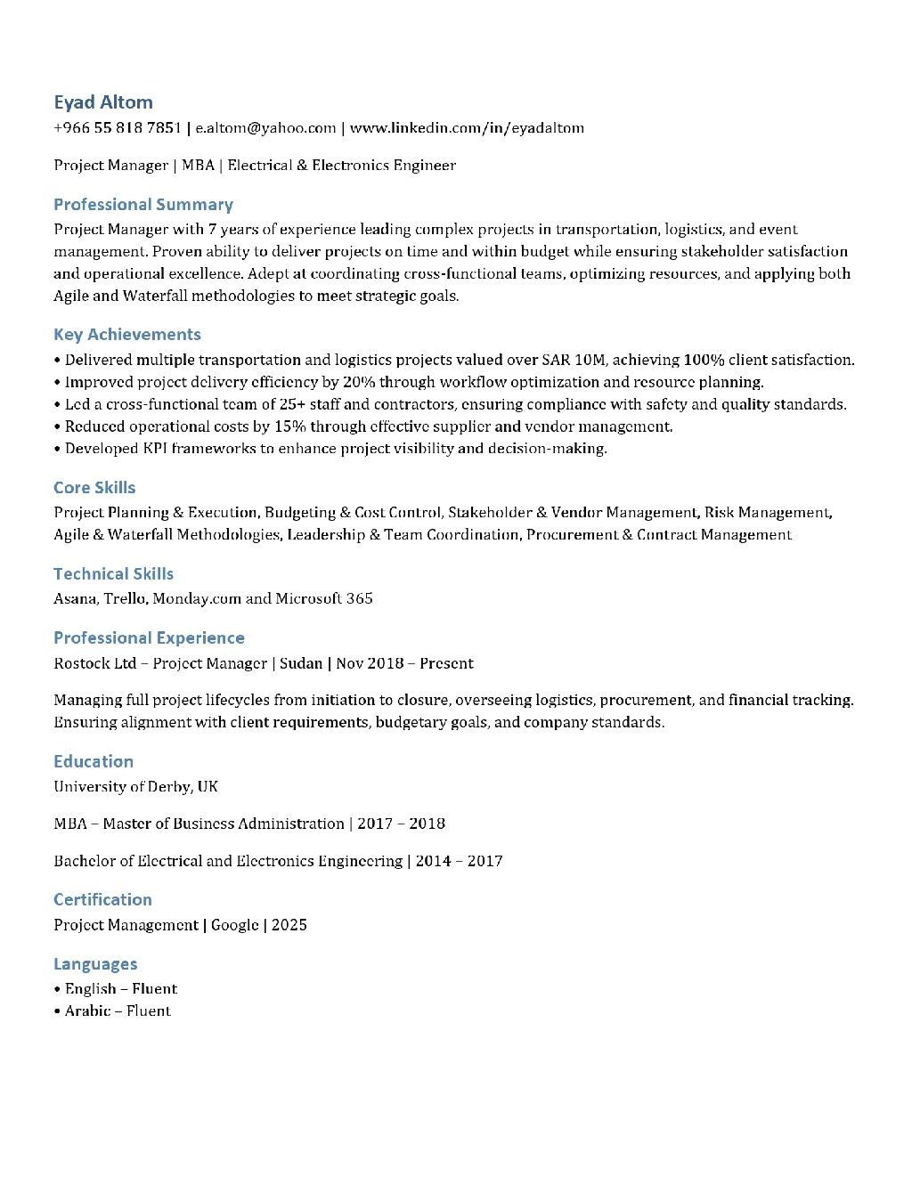 ابحث عن وظيفة مدير مشروع، لدي خبرة 7 سنوات في ادارة المشاريع، حاصل على بكالوريوس في هندسة الكهرباء والالكترونيات بالاضافة لماجستير في ادارة الأعمال من بريطانيا أتحدث العربية والانجليزية بطلاقة