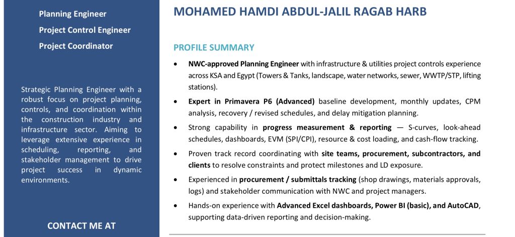 مهندس تخطيط ومتابعة معتمد من شركة المياه الوطنية خبرة عملية داخل مكتب إدارة المشاريع باحدى شركات المقاولات الكبرى. مسؤول عن اعداد وتحديث الجداول الزمنية، متابعة التقدم الفعلي، اصدار التقارير الدورية، وتنسيق متطلبات المشروع بين الأطراف لضمان سير الأعمال وفق الخطط المعتمدة