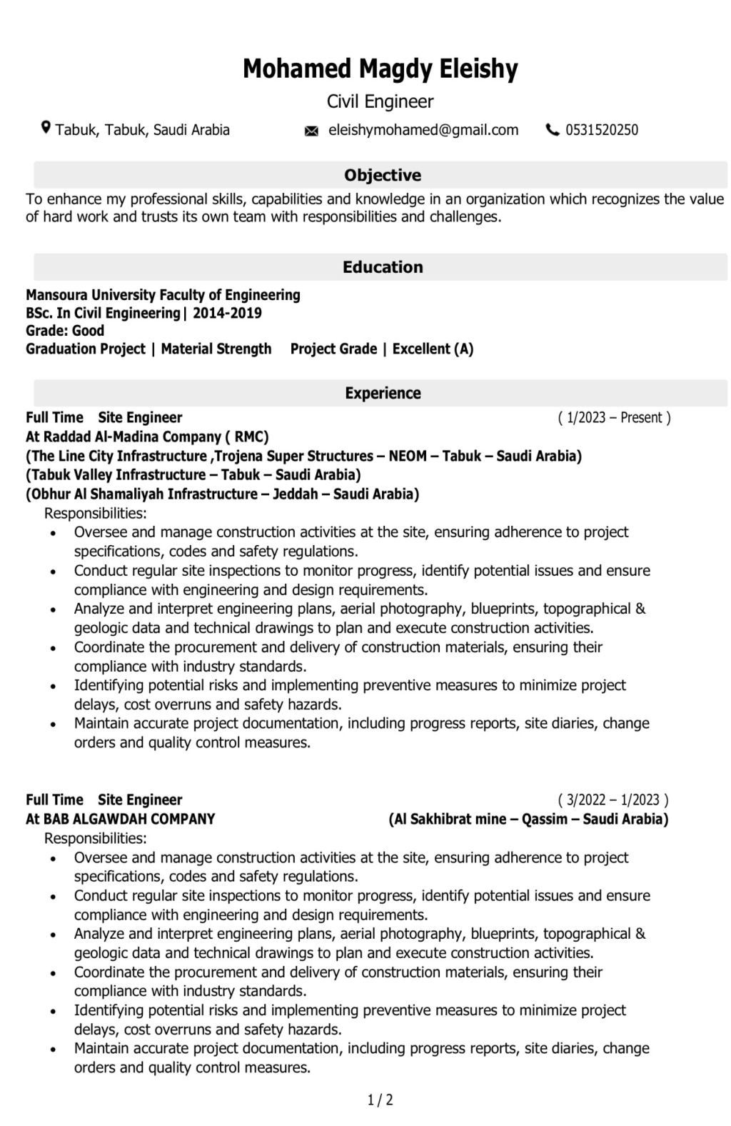مهندس مدني مصري خبرة 6 سنوات ابحث عن عمل خبرات العمل خرسانات وتشطيبات وبنية تحتية، عملت في الخرسانات لدى مشروع مدينة الموظفين في أمالا ومشاريع لدى نيوم في شرما وتر وجينا وعبارة مجرى سيول بتب وكالتشطيبات بمدينة أمالا والوجه، البنيه التحتية مشروع تمديد أنابيب مياه أقطار أكبر من 400 لدى شركة المياه الوطنيه بأبحر الشماليه في جدة ومشروع صرف صحي لدى المياه الوطنيه ببريده جاهز لنقل كفالة والعمل في أسرع وقت