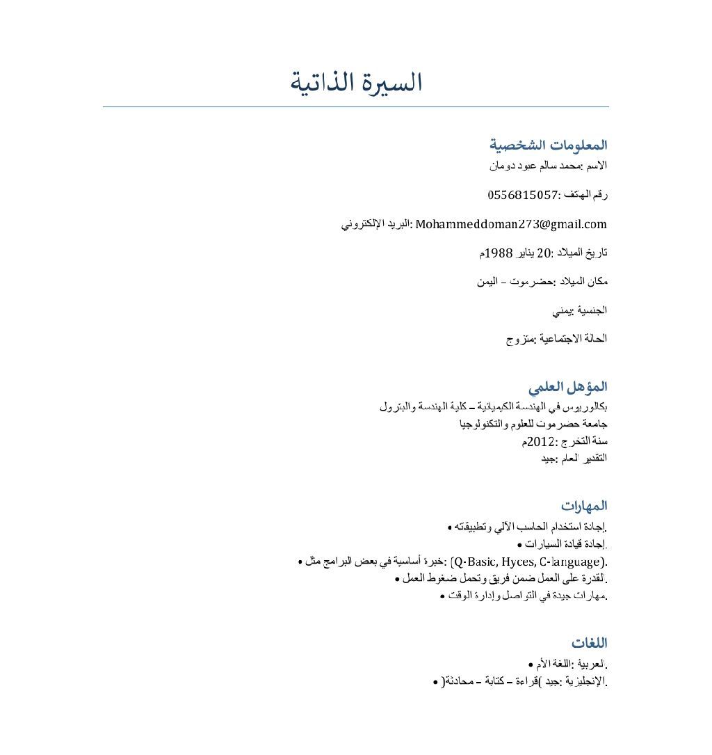 مهندس كيميائي جاهز للانضمام الى فريق عمل محترف في مجال الهندسة الكيميائية مرفق لك السيرة الذاتية